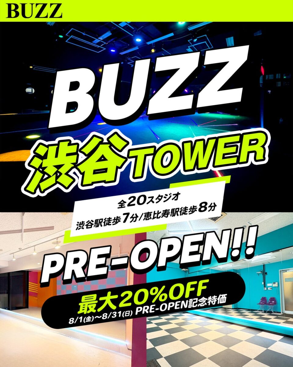 株式会社BUZZ GROUP(本社:東京都港区、代表取締役:渡辺 憲)が運営するレンタルスタジオ「STUDIO BUZZ」の革命的新拠点「BUZZ渋谷TOWER」が、8月1日よりプレオープンを開始いたしました。全20スタジオ・7階建ての圧倒的規模で、業界初※のムービング/レーザー照明を完備。BUZZ史上最大にして最強のハイスペックスタジオとして、日本のダンスシーンに革命をもたらします。