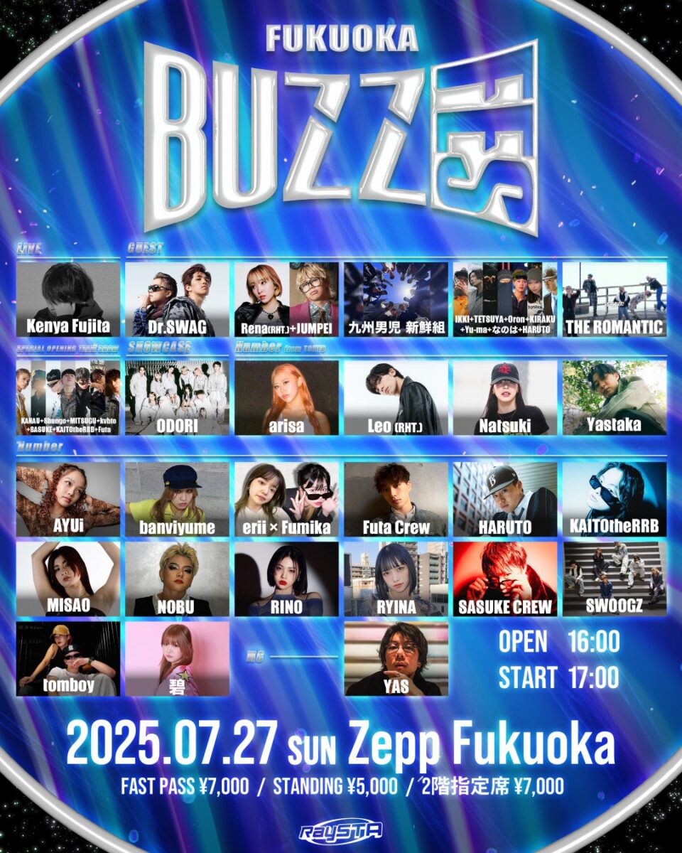 最最先端のダンスイベントを多数手掛ける株式会社RaySTA(本社:東京都港区、代表取締役社長:飯田勇翔、以下「RaySTA」、https://raysta.jp/)と、レンタルスタジオ「STUDIO BUZZ」が共同で企画・制作を行った大型ダンス&音楽イベント「BUZZ FES 2025 -FUKUOKA-」を、2025年7月27日(日)、Zepp Fukuokaにて開催いたしました。福岡でのBUZZ FES開催は今回が初となります。