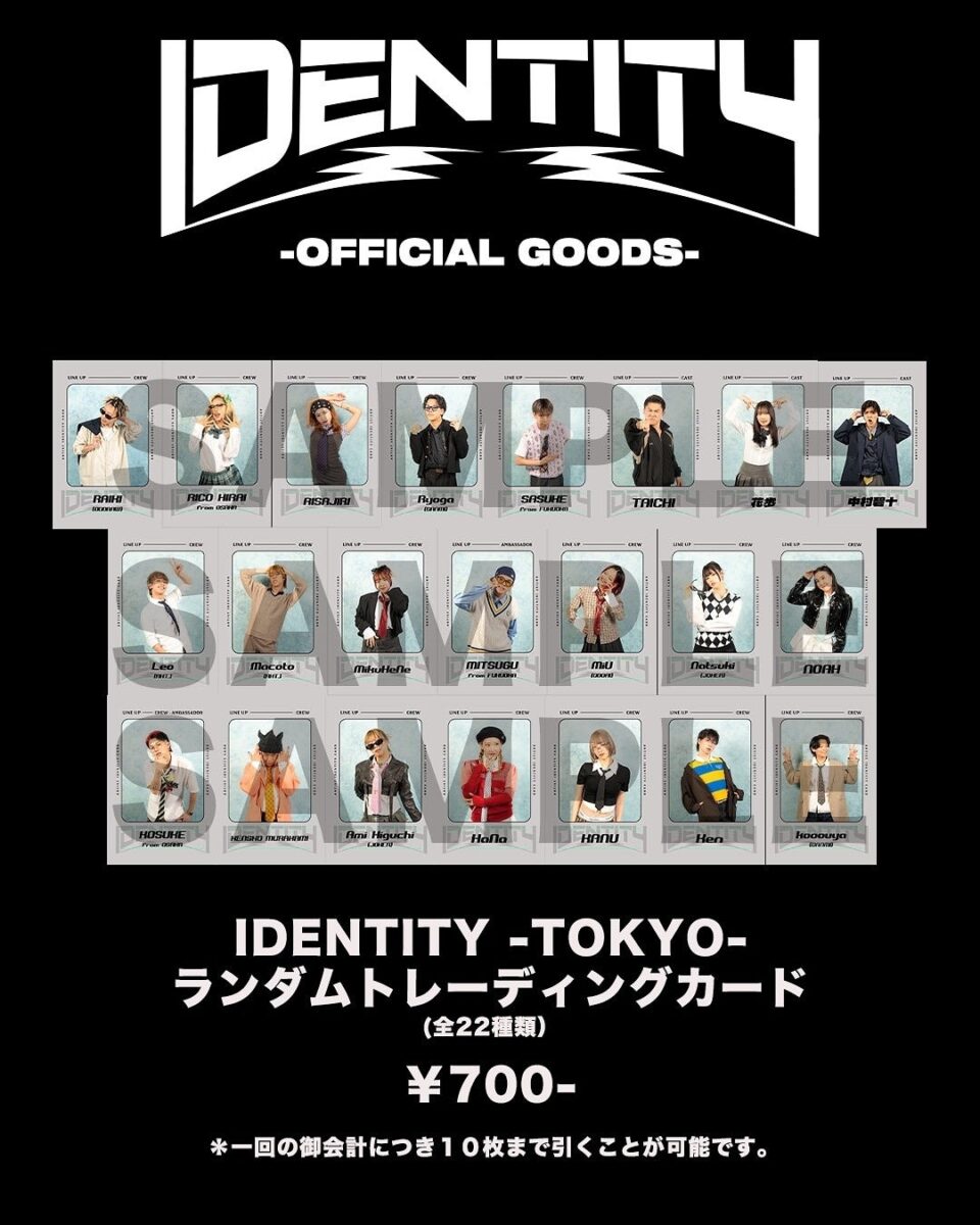 グッズの展開も本イベントの大きな見どころのひとつ。なかでも今回の注目は、出演ダンサーを収録した 「IDENTITY -TOKYO- ランダムトレーディングカード」。ここでしか手に入らない特別アイテムとして、ぜひコレクションしていただきたい。その他にも、Tシャツやキャップといったオリジナルグッズ、豪華賞品が当たるガチャなど多彩なラインナップをご用意。