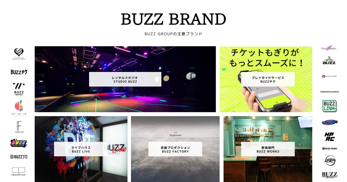 事業領域は、ライブハウス運営(BUZZ LIVE)、芸能プロダクション(BUZZ FACTORY)、飲食事業(BUZZ WORKS)まで多岐にわたり、年間300以上のイベント開催と1000以上のコンテンツ制作実績を有しています。
