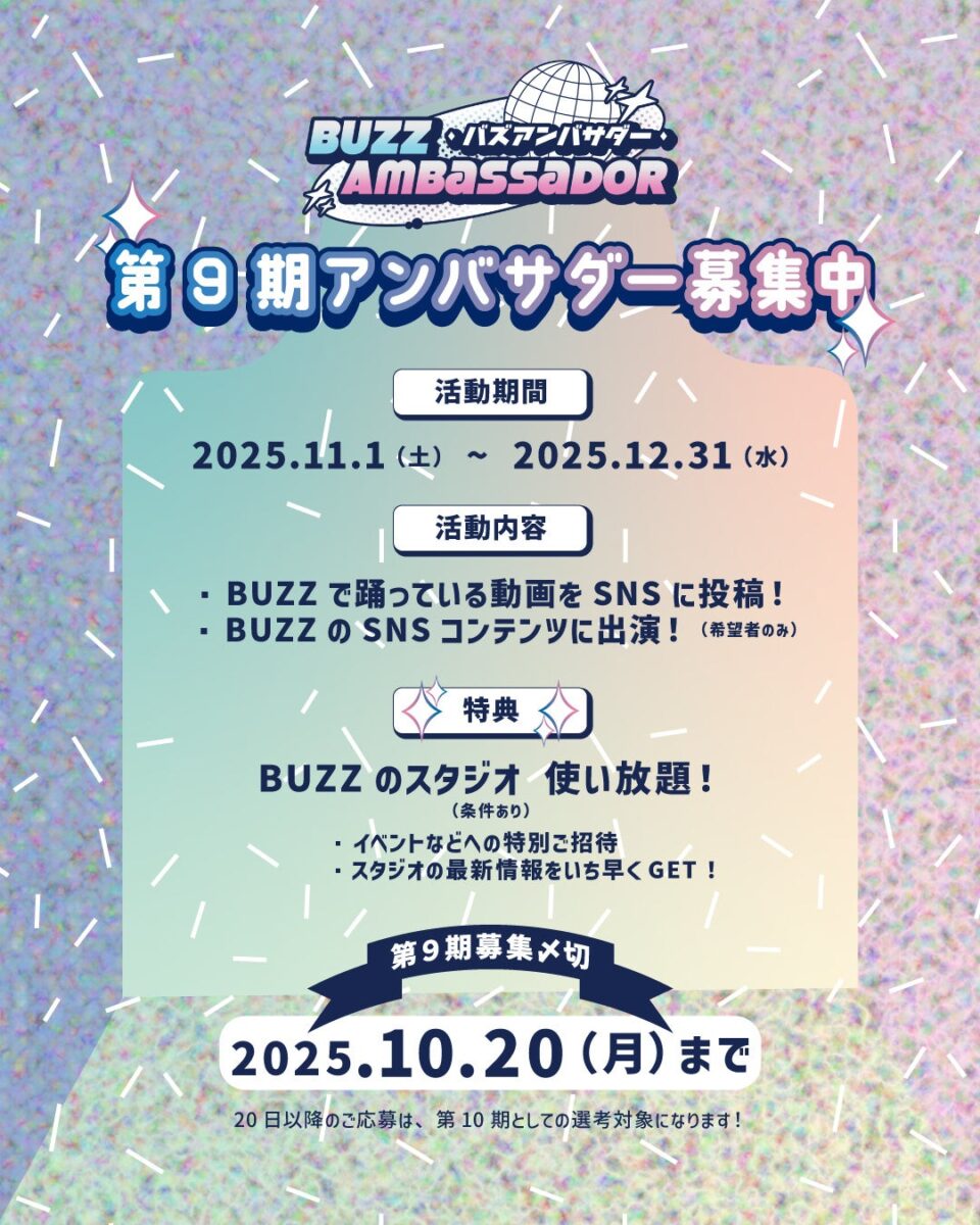 関東を中心にレンタルスタジオを81店舗以上展開し、月間利用者数25万人以上、会員数18万人を突破するレンタルスタジオ「STUDIO BUZZ」の運営を行う株式会社BUZZ GROUP(本社:東京都港区、代表取締役:渡辺 憲)は本日、第8期BUZZアンバサダーに就任する5組のパフォーマーを発表いたします。
